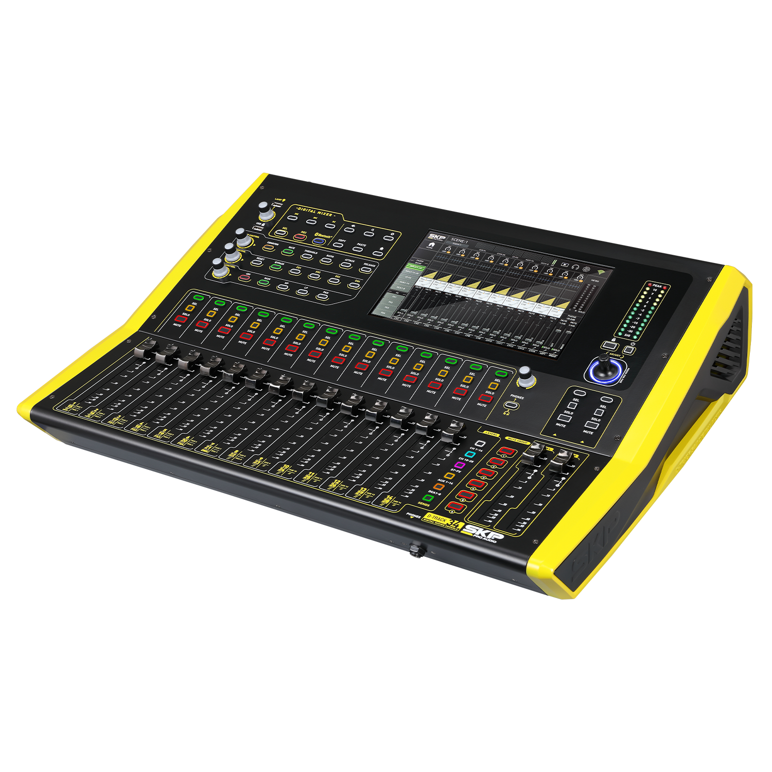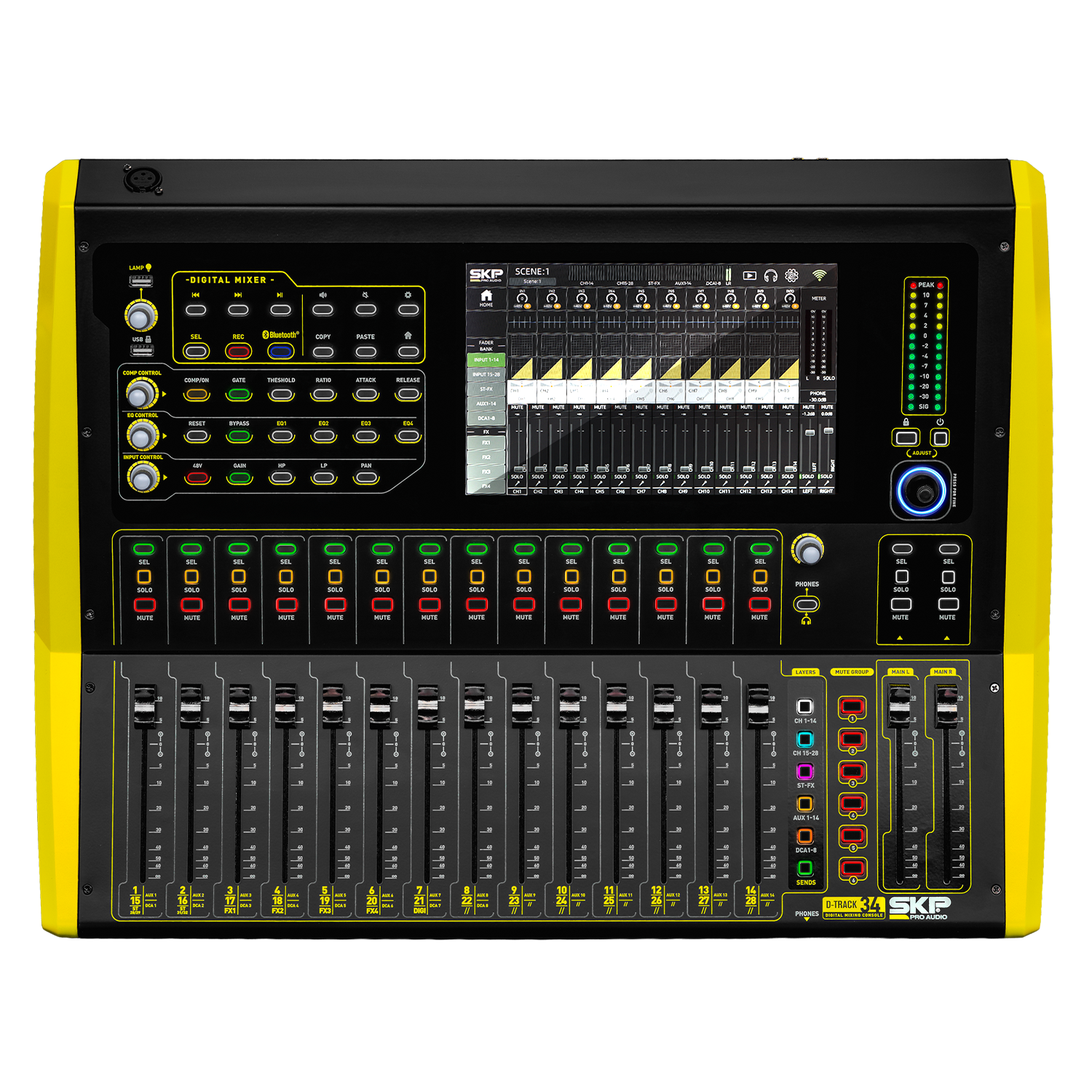 La SKP D-Track 34 se presenta como una consola digital de alta densidad, diseñada para quienes buscan un control físico total sin sacrificar la flexibilidad moderna. Su arquitectura de 28 entradas analógicas combo y 16 faders motorizados permite gestionar mezclas complejas con una respuesta táctil inmediata, mientras que su generosa pantalla de 10 pulgadas facilita el monitoreo detallado. Además, destaca su capacidad como herramienta de estudio gracias a una potente interfaz USB 30x28, que la convierte en el núcleo central de cualquier flujo de grabación multicanal o transmisión en vivo de gran escala.